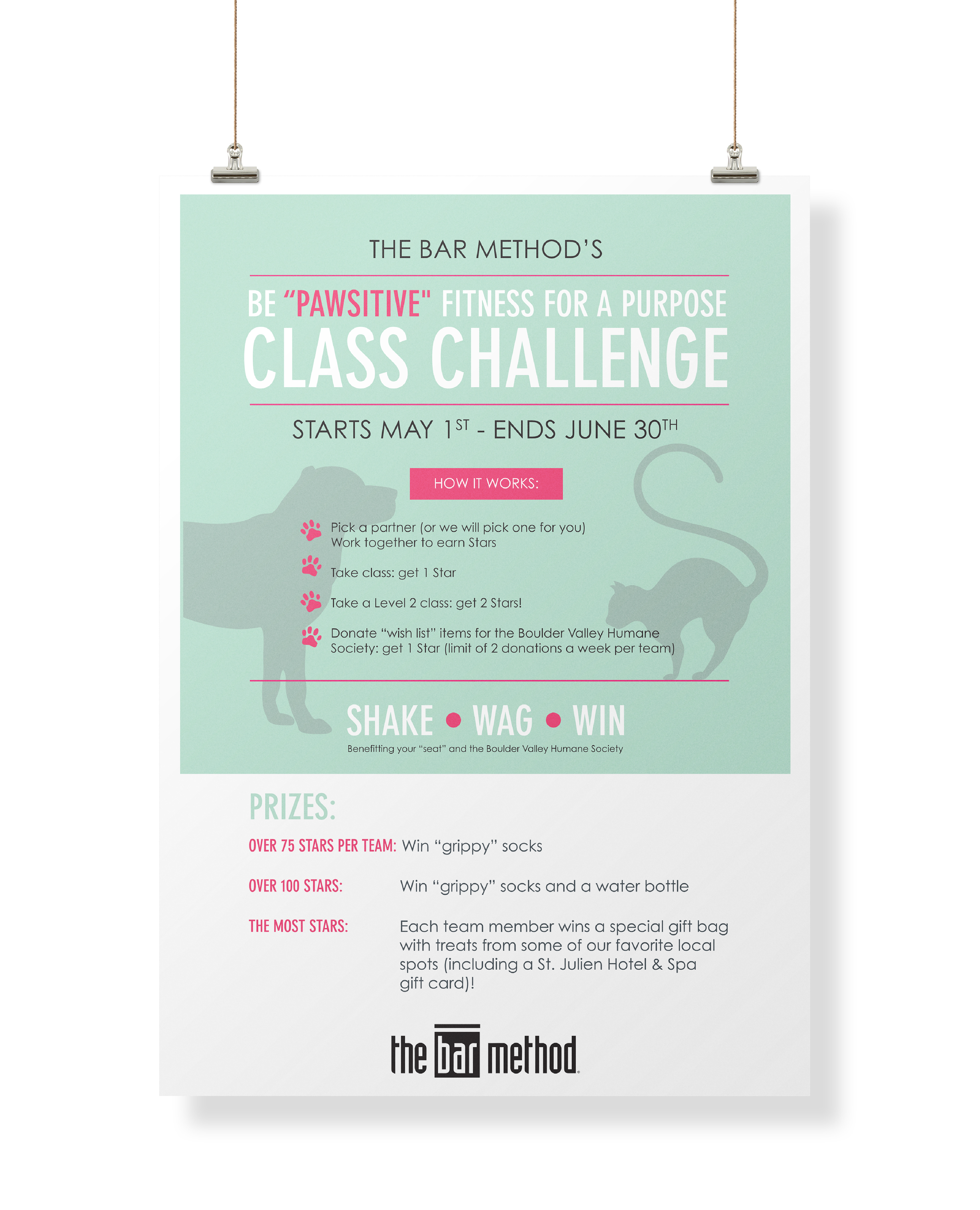 Bar Method Boulder marketing collateral and in-store signage. Bar Method Boulder is a privately-owned studio that is part of a national franchise of Bar Method studios. These custom designs were created specifically for the Boulder Colorado studio, based on Bar Method brand standards.